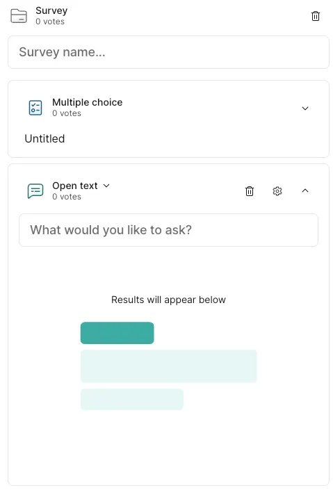 • Survey - Create a survey combining multiple questions (unlike the above 6 types, participants answer multiple questions collectively as one set).
