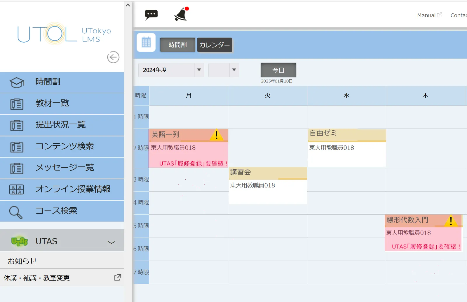 UTOL(UTokyo LMS)における「履修」という用語が,教務的な(学部通則等で用いる)「履修」とは異なる用法で使用されていることによる混乱を解消するため,2025年3月25日(火)に時間割表やコーストップ画面の一部を修正しました.これにより,UTASと連携されている科目(コース)に「学生」ユーザが「履修者」として参加しているが,UTASでの履修登録をしていない場合,時間割表やコーストップ画面にUTASでの履修登録を促す文言などが表示されるようになりました.