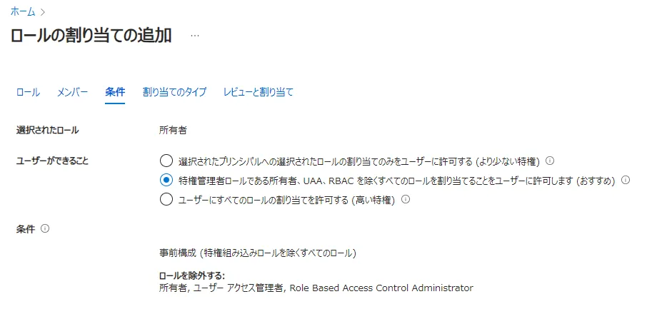 特権管理者ロールである所有者,UAA,RBACを除くすべてのロールを割り当てることをユーザーに許可しますを選択してください. - サブスクリプションを相手に引き継ぐ場合のみ