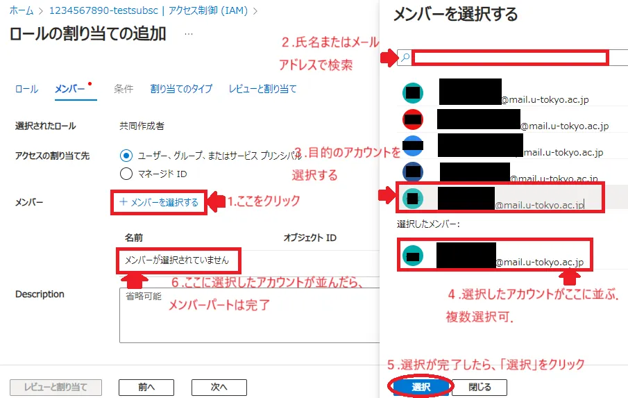 +メンバーを選択するをクリックしてください,右側に権限を付与したいアカウントの検索・選択画面が現れるので,条件を絞って検索し権限を付与したいアカウントを見つけ出して選択してください.最後に選択画面下にある選択をクリックすると左のメイン画面に選択したメンバーが表示されます. - Description:必要に応じて説明を追加してください.