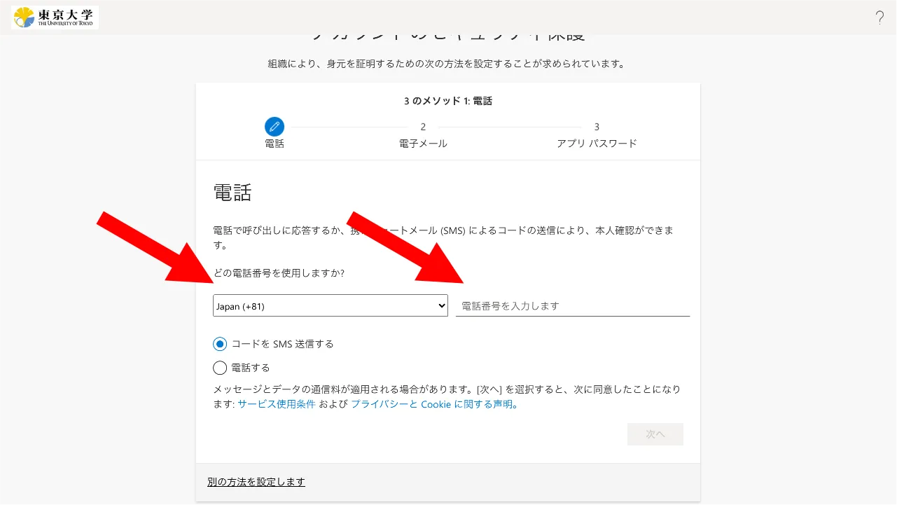 • 電話番号でSMSを使う場合:SMSにコード(6桁の数字)が送られ,それを入力するように求められるので,そのようにしてください.