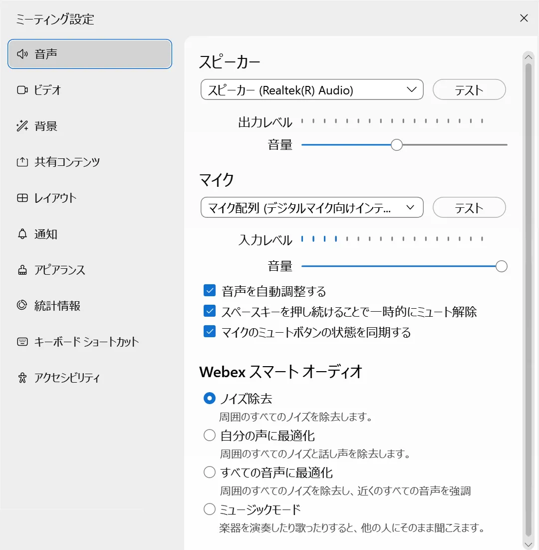 - マイク : 使いたいマイクを選択できます(別途マイクを接続している場合,複数の選択肢が出てくるため,目的のものを選択してください).正しくマイクから音が拾えていれば下のメーターが振れます.「テスト」をクリックすると,選択したマイクからの音声を短時間録音して再生してくれるので,マイクを確認することができます.必要に応じて「音声を自動調整する」にチェックを入れて下さい.一般的には「ノイズ除去」を選択しますが,近くで別の人が話をしている時には「自分の声に最適化」を選択すると別の人の声をフィルタできることもあります.「ミュージックモード」を選択すると,ノイズリダクション機能が無効化され,背景で流れているBGMやノイズ等も送出されるようになります.