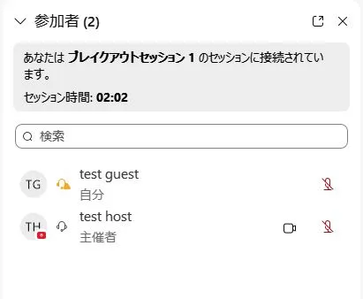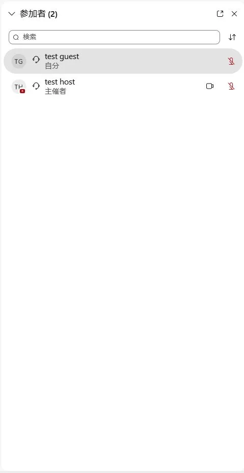 - マイクのアイコン: マイクのアイコンが赤くなっている参加者は,マイクがミュート状態になっています.主催者は,参加者のマイクをミュートすることもできます.上の図では,test hostとtest userのマイクはミュート状態になっています.