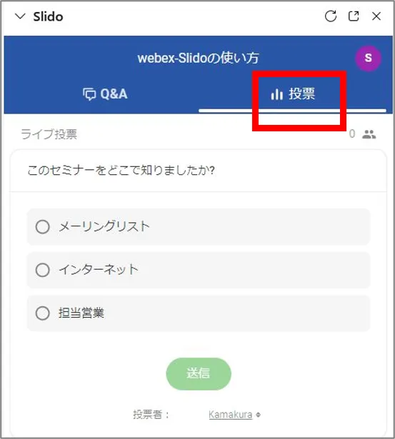 - 主催者がPollの操作をすると,投票タブにPollの回答画面が表示されます.