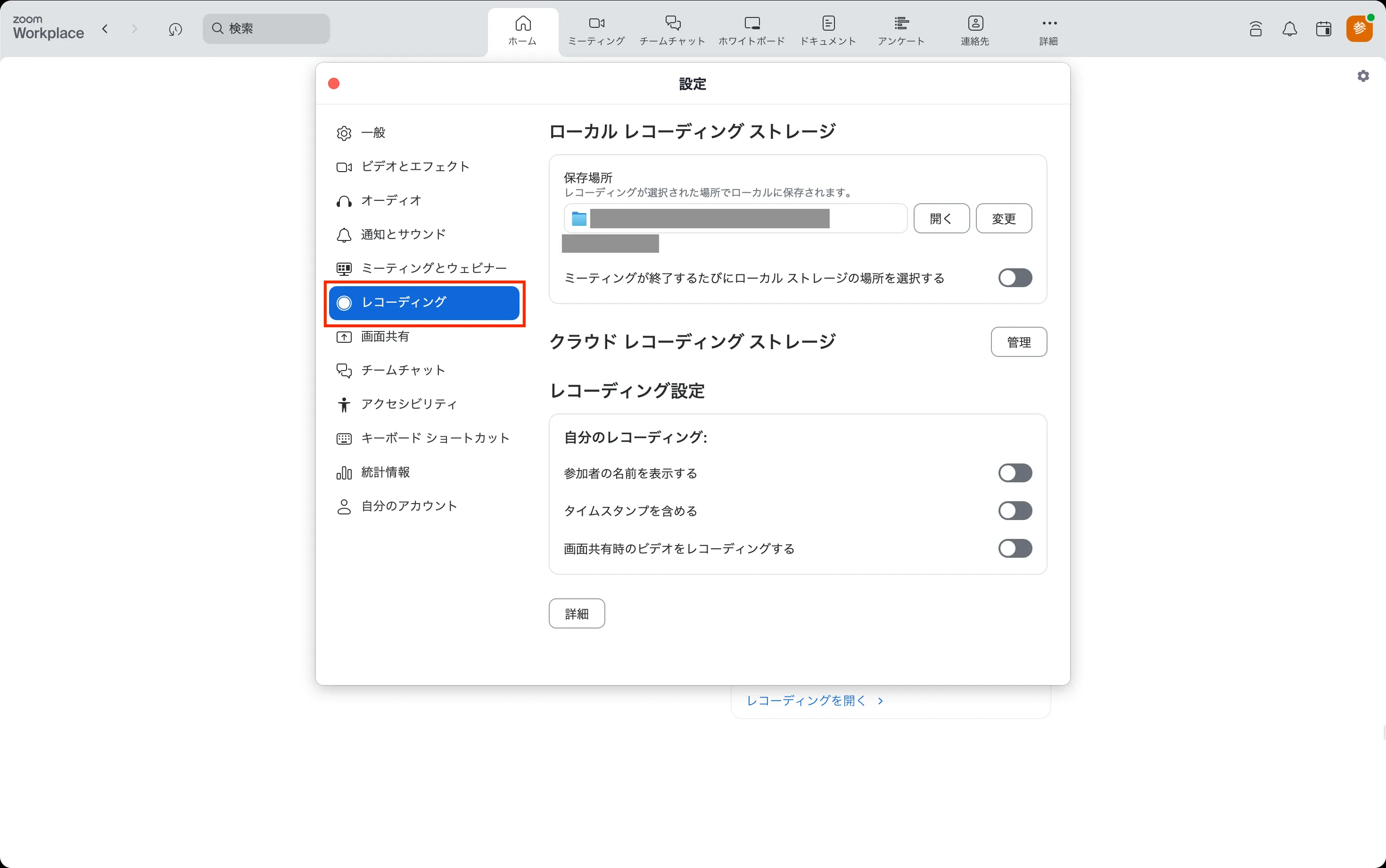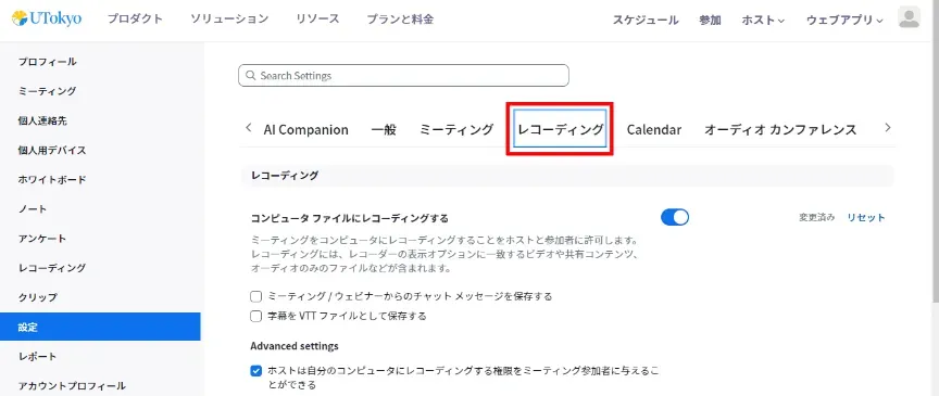 2. ウェブポータルの「設定」から「レコーディング」を開いてください.
