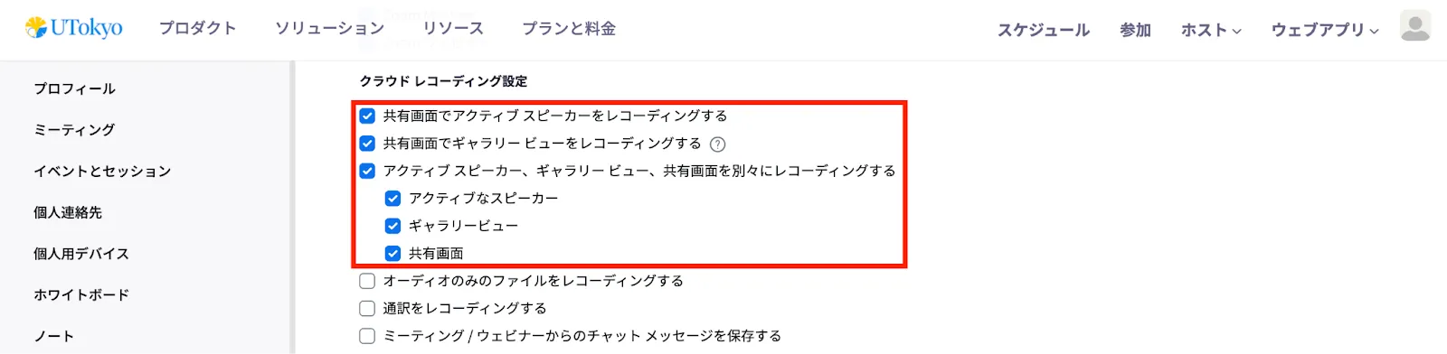 • そのうえで,「アクティブスピーカー」,「ギャラリービュー」,「共有画面」の中からレコーディングしたい項目にチェックを入れてください.